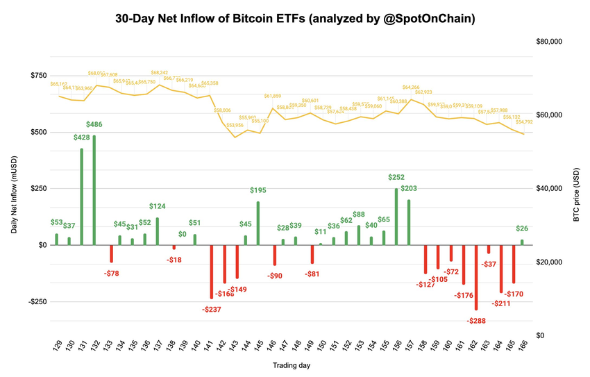 “Nettoflödet blev positivt efter 8 dagar av kraftiga utflöden. Gårdagens enda utflöden tillhörde Grayscale (GBTC) och BlackRock (IBIT), de två största amerikanska Bitcoin-ETFerna,” sade analytiker på SpotOnChain.