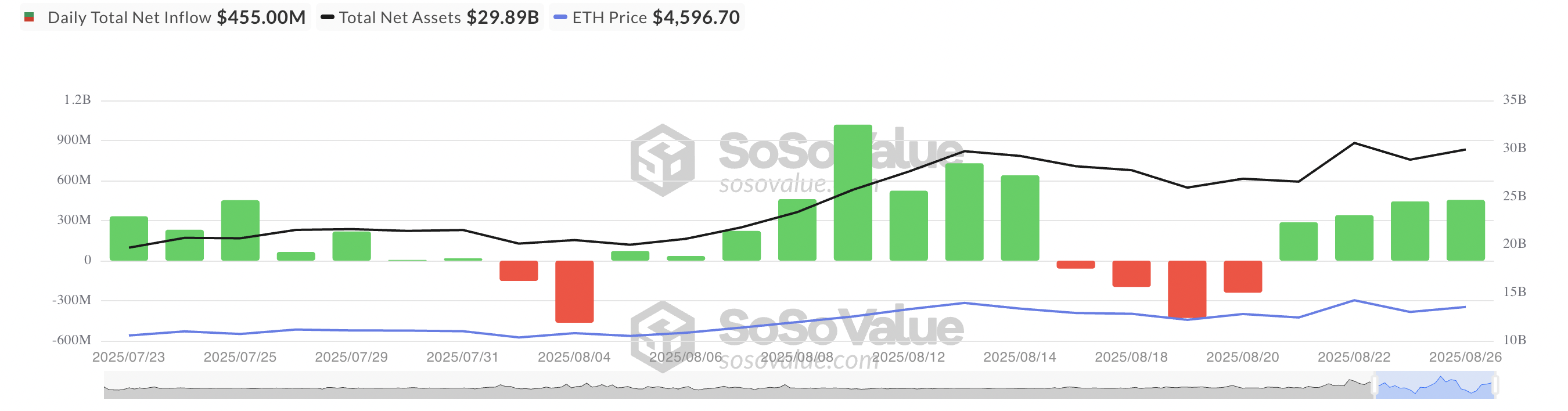 Ethereums dagliga ETF-inflöden har hållit sig konsekvent starka under veckan, med en topp på 455 miljoner USD den 26 augusti. Däremot har Bitcoin ETF:er kämpat för att behålla momentum, tyngda av nettoutflöden, inklusive nästan 200 miljoner USD som lämnade den 21 augusti.