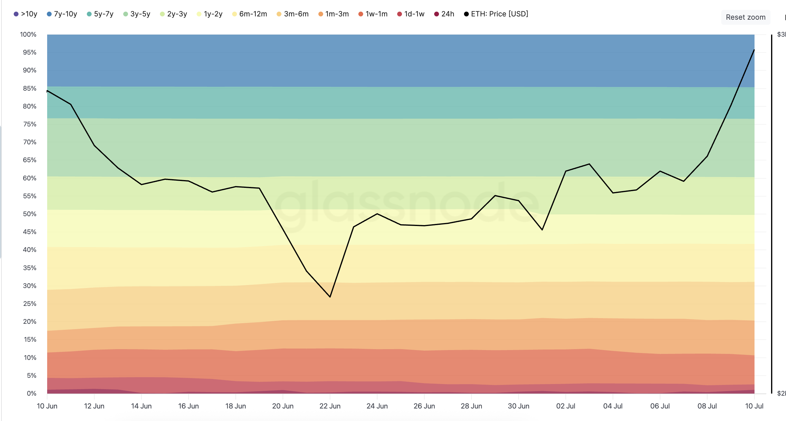 ETH-pris över 3 000 USD är inte bara tekniskt; det är beteendemässigt. Enligt Glassnodes HODL Waves, som mäter procenten av ETH som hålls över olika tidsperioder, har kortsiktiga innehavare (särskilt 1v–1m, 1m–3m och till och med 10Y-band) ökat stadigt de senaste dagarna.