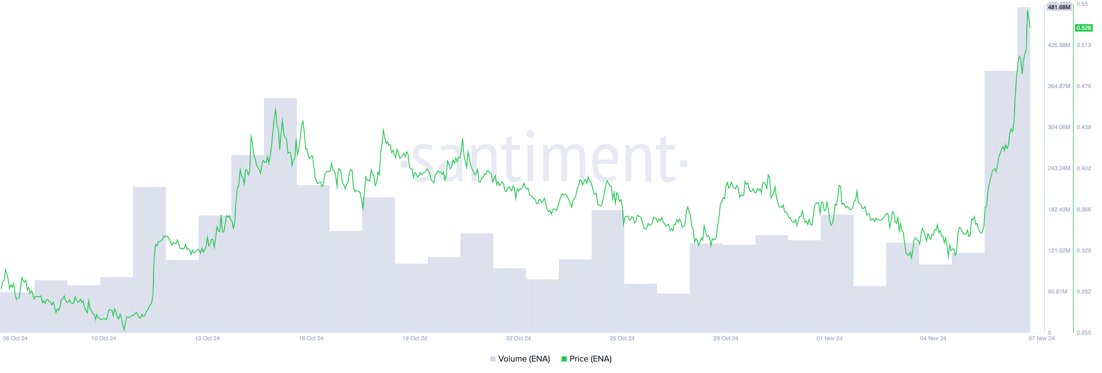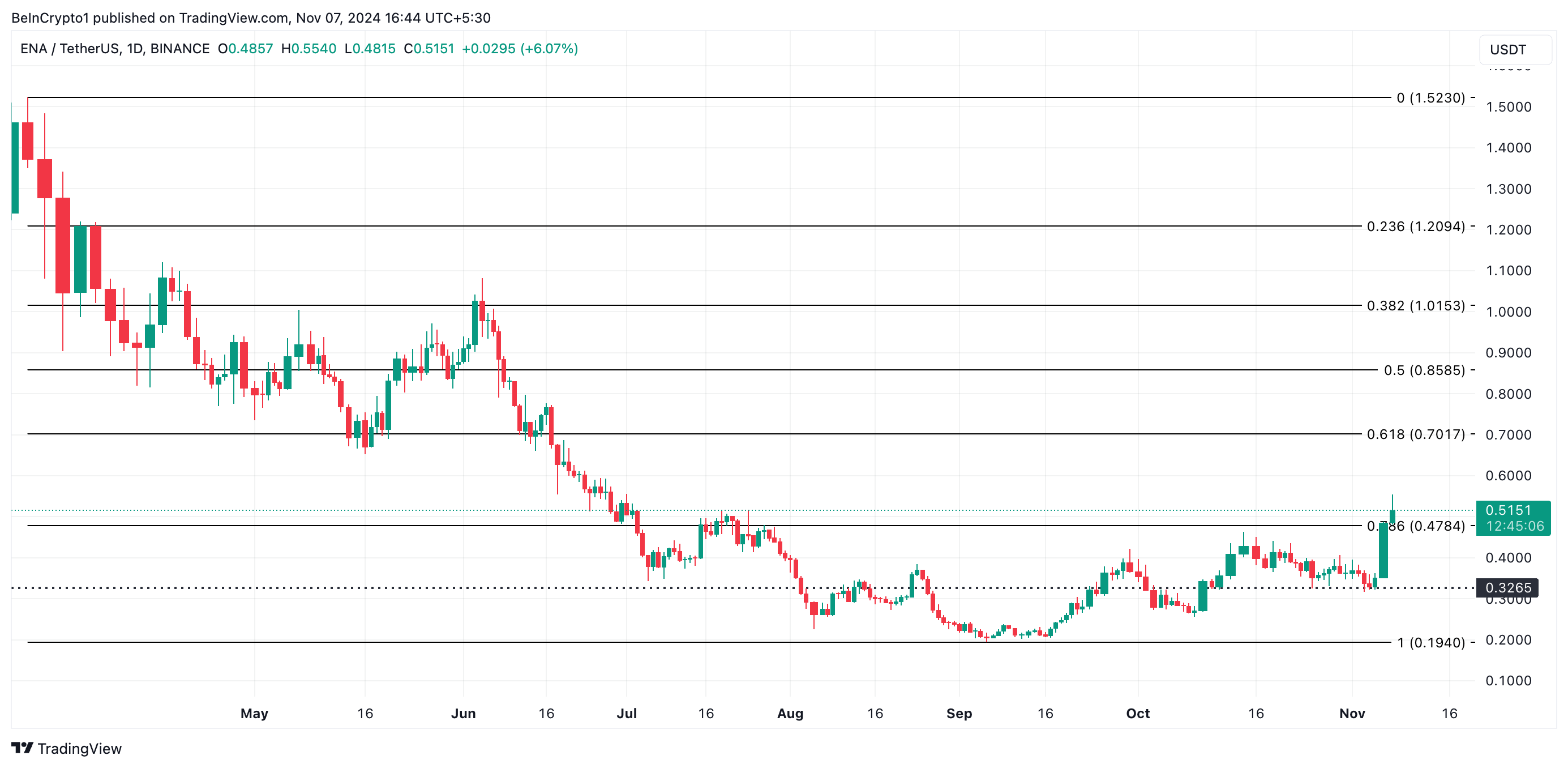 ENA handlas för närvarande till 0,51 USD. Dess tvåsiffriga prisökning har drivit den förbi den kritiska motståndsnivån på 0,47 USD. Om köptrycket håller i sig kan det förvandla den till ett stödgolv. Om detta inträffar kommer ENA:s pris sannolikt att rally mot 0,70 USD.