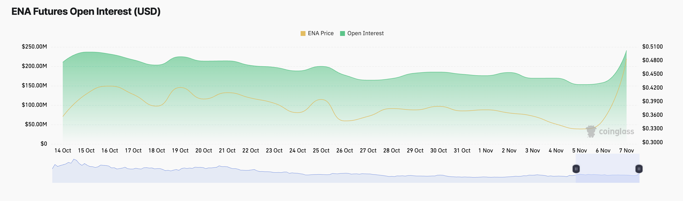 Dessutom har ENA:s öppna intresse (OI) också vuxit. Enligt data från Coinglass har det ökat med 54% under de senaste 24 timmarna.