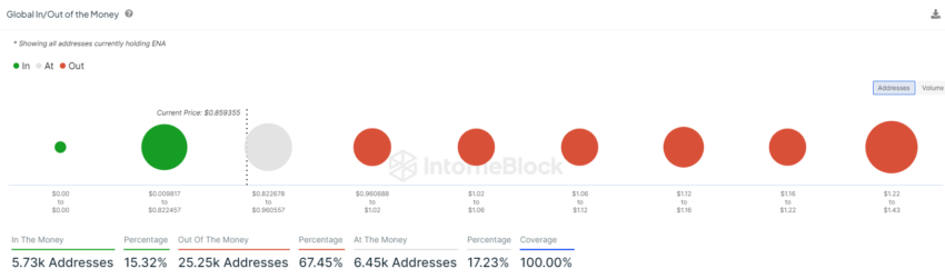 De senaste uppgifterna indikerar ett starkt innehavsmönster bland investerare, med en betydande 67,45% av ENA-innehavarna “Out of the Money”, vilket innebär att deras innehavspris är högre än det aktuella marknadspriset. Detta kommer sannolikt att leda till en avmattning i försäljningen på nuvarande nivåer och tvinga majoriteten av innehavarna att fortsätta hålla tills deras positioner vänder “In the Money”.