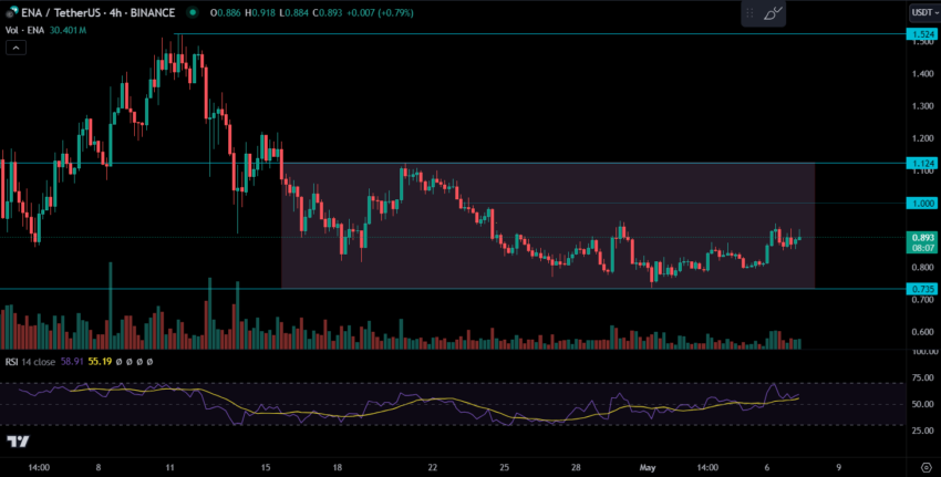 Teknisk analys av ENA:s prisdiagram visar en konsolideringsfas med priset stabiliserat över viktiga Fibonacci-stödnivåer. Relative Strength Index (RSI), som för närvarande ligger på 55, pekar på ett balanserat marknadsförhållande, varken överköpt eller översålt.