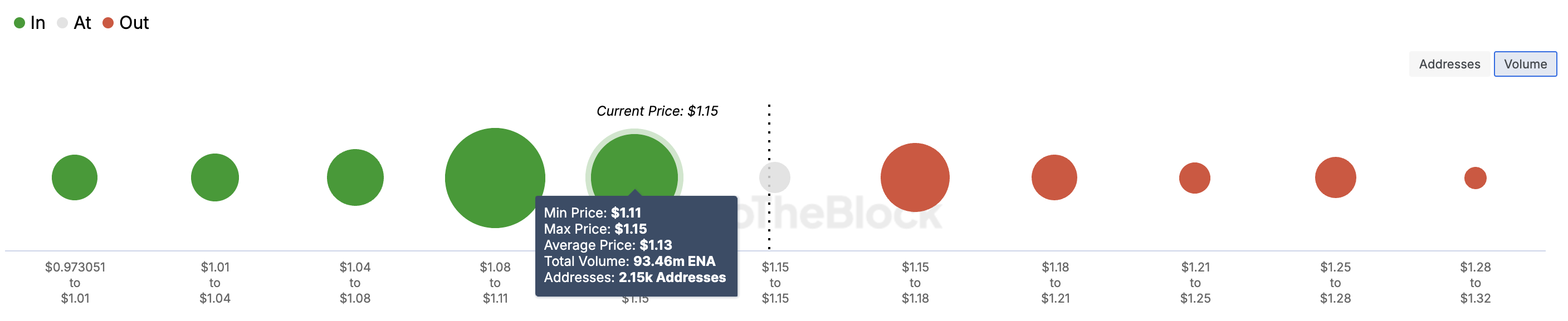 BeInCrypto genomförde en analys med hjälp av In/Out of Money Around Price (IOMAP) för att utvärdera ENAs potential som en topp altcoin-vinnare. IOMAP grupperar adresser i tre kategorier: de som är i vinst vid nuvarande pris, de som håller vid orealiserade förluster och adresser vid brytpunkten.