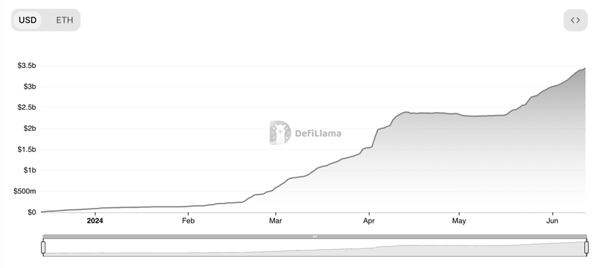 Intressant nog har det totala värdet av tillgångar som är låsta (TVL) på protokollet fortsatt att stiga, trots ENA:s prisnedgång. Med 3,44 miljarder dollar är Ethenas TVL på sin högsta nivå någonsin.