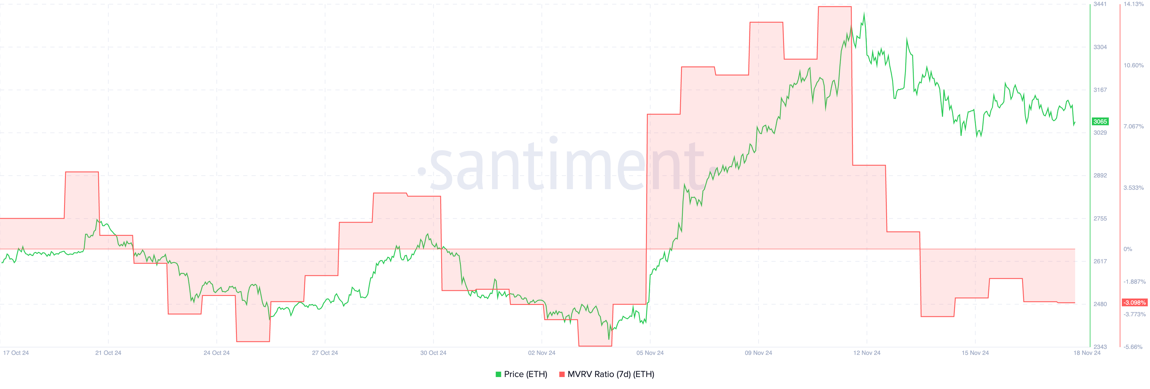 Intressant nog låg MVRV 7D-förhållandet runt liknande nivåer den 5 november innan en kraftig prisrally tog ETH från 2 400 USD till 3 400 USD på bara en vecka, vilket visar hur detta kan hända igen snart.