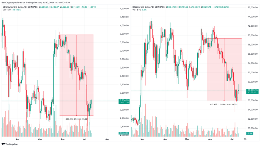 Jämfört med BTC har ETH:s pris genomgått en mer betydande korrigering. Från 28 maj till 9 juli sjönk Ethereums pris med 24,65%.