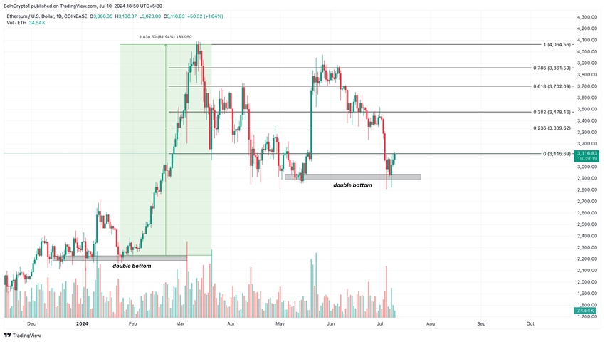 Historiskt sett ger dock relativt sett djupare korrigeringar en möjlighet till högre priser. Intressant nog visar det dagliga ETH/USD-diagrammet en dubbelbottenformation i detta syfte.