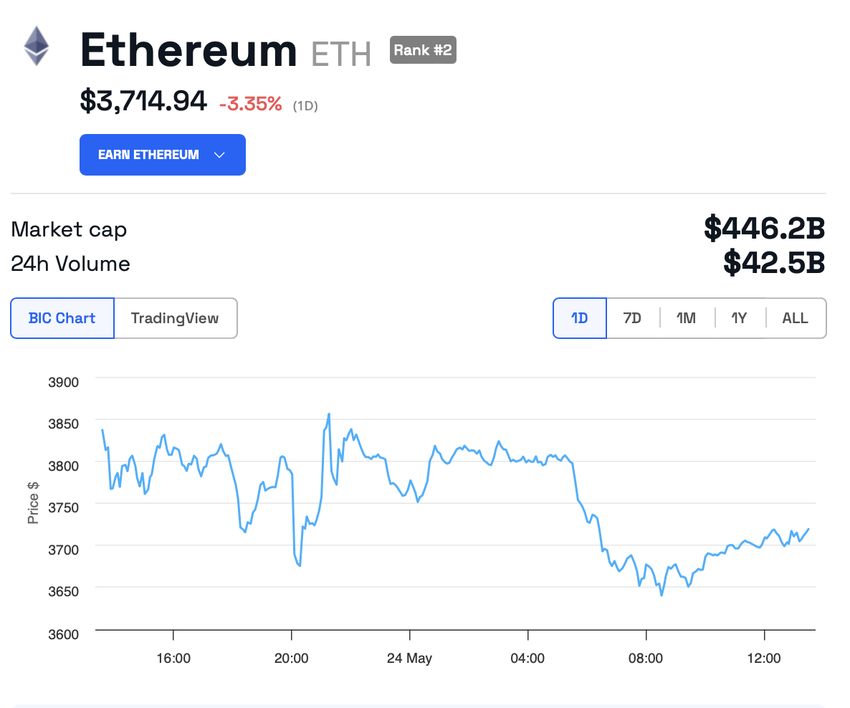Dynamiken i den näst mest kapitaliserade kryptovalutan är dock fortfarande långt ifrån hausseartad. Efter SEC-beslutet ökade Ethereums pris med bara 1%. Vid tidpunkten för godkännandet handlades ETH till 3 840 USD. Enligt BeInCrypto har det sedan dess sjunkit med 3,5% till 3 714 $.