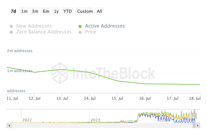ETH bevittnar en uppgång i cirkulerande utbud när användaraktiviteten på dess nätverk sjunker. On-chain-data från IntoTheBlock bekräftar att detta har varit fallet för proof-of-stake-nätverket (PoS).