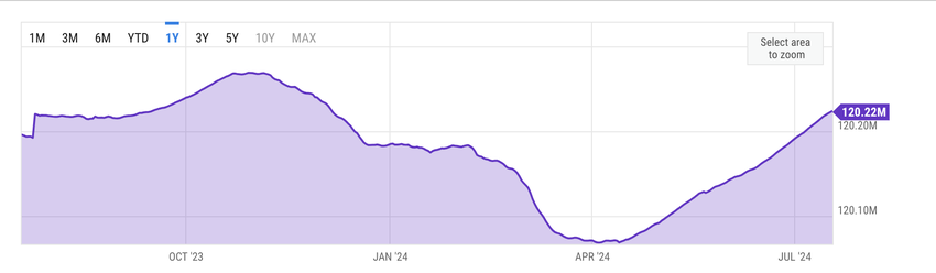Med 120,22 miljoner ETH vid presstillfället ligger altcoinets cirkulerande utbud på en hög nivå som senast observerades i december 2023.