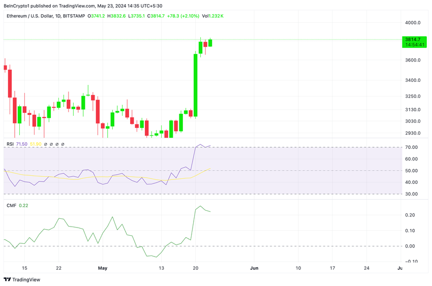 Som bekräftelse på den pågående hausseartade trenden var ETH: s Relative Strength Index (RSI) i en uppåtgående trend vid presstiden. Med ett värde på 71,21 signalerade momentumindikatorn att marknadsaktörer föredrar att ackumulera mer ETH snarare än att sälja sina mynt.