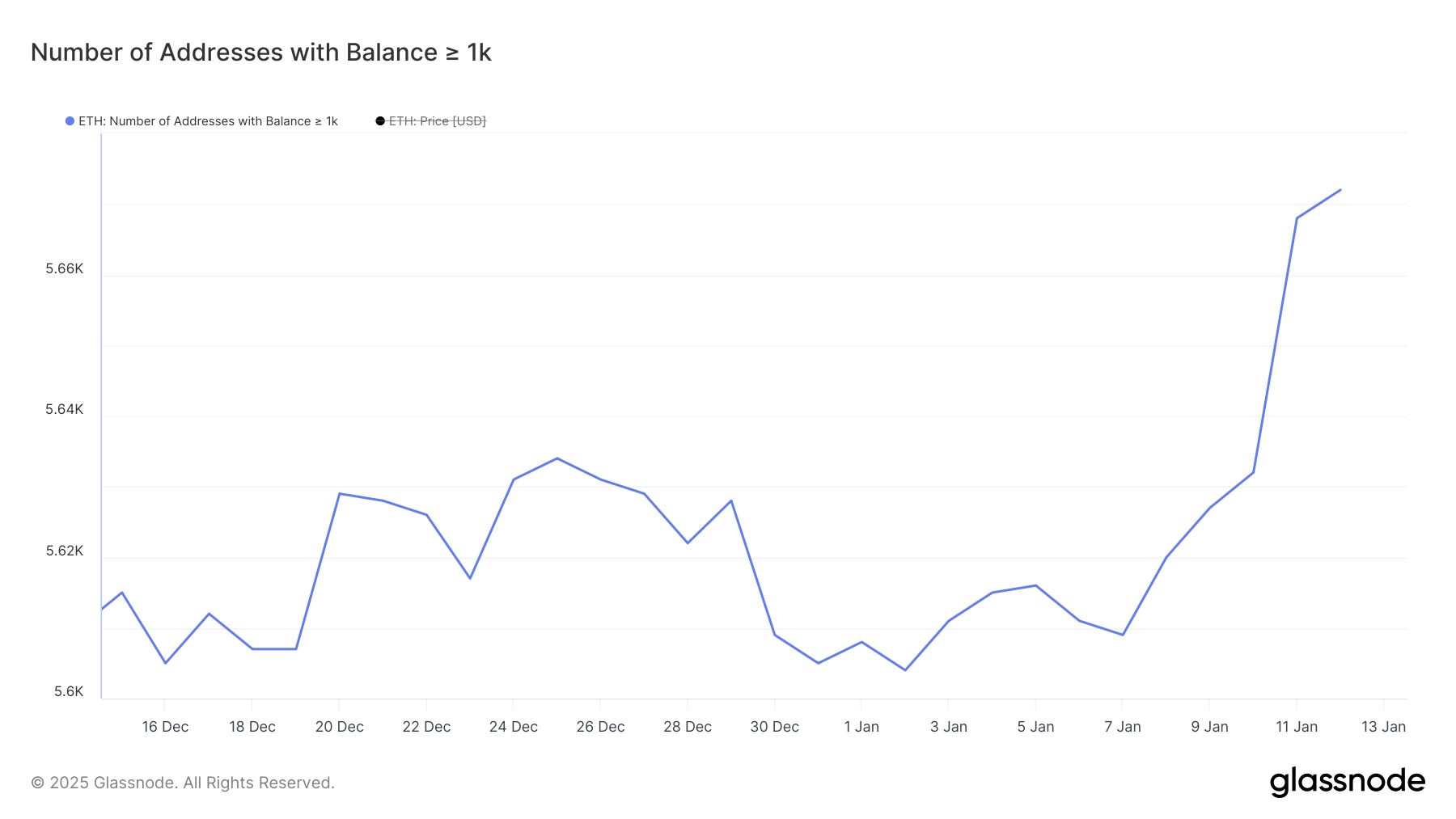 Mellan 7 januari och 12 januari ökade antalet adresser som håller minst 1 000 ETH från 5 609 till 5 672, vilket markerar en betydande ökning av stora innehavare under denna period av prisnedgång.