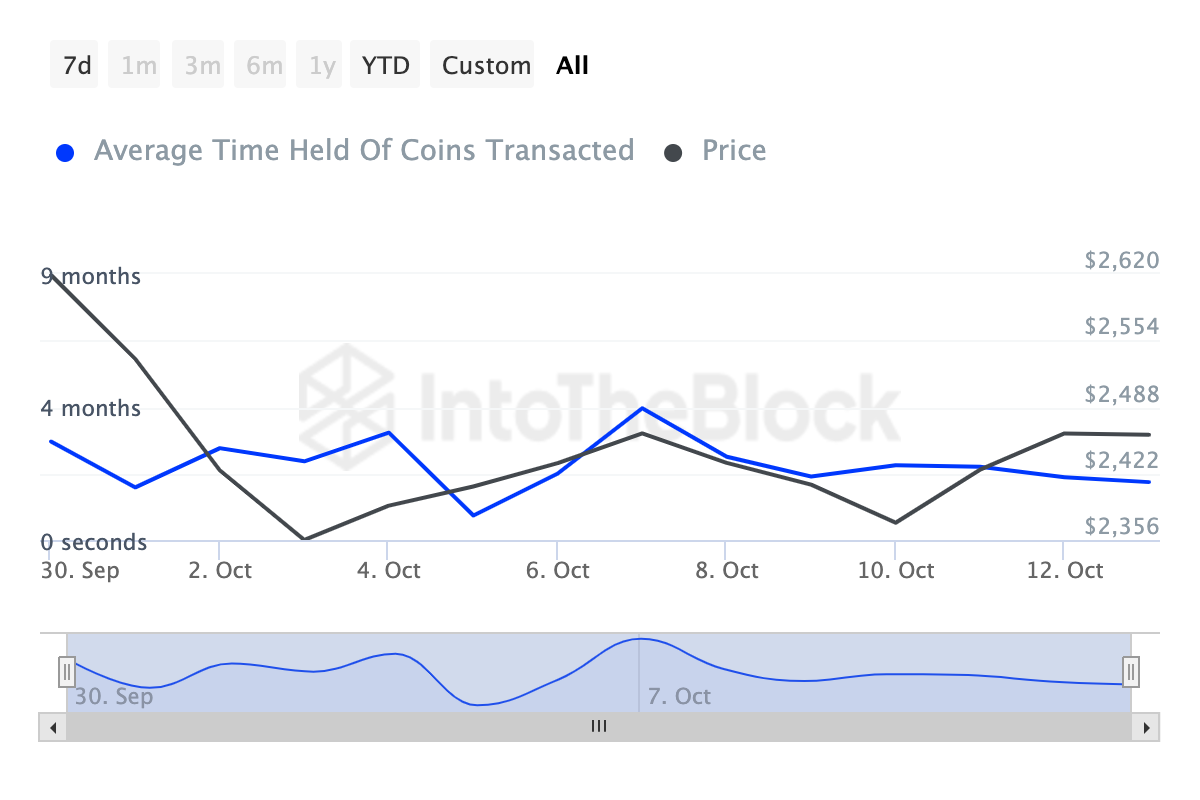 Trots detta visar data från IntoTheBlock att Ethereum’s Coins Holding Time har minskat med 56% under de senaste sju dagarna. Coins Holding Time visar hur länge investerare har hållit en kryptovaluta utan att sälja den.