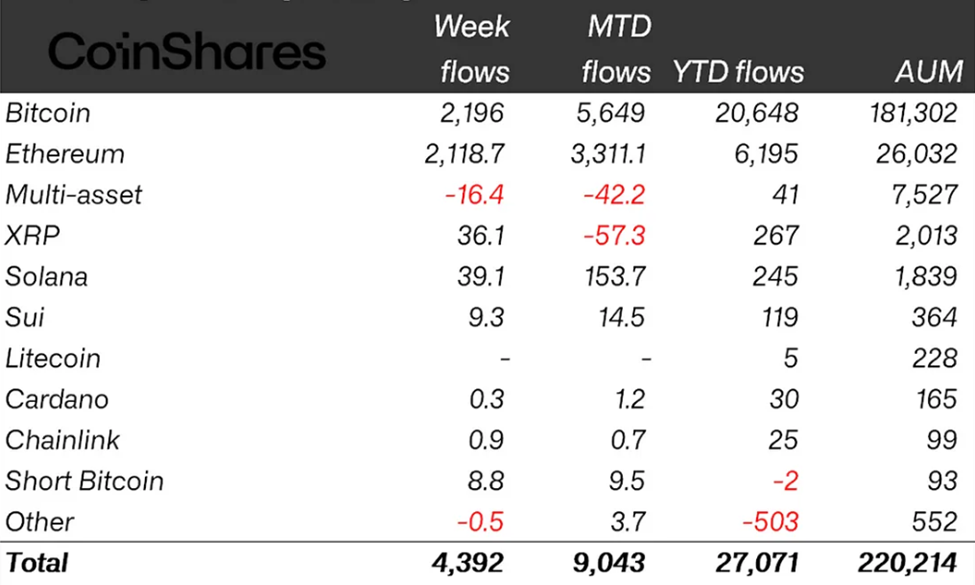 “Digitala tillgångsinvesteringsprodukter registrerade sina största veckoinflöden någonsin, totalt 4,39 miljarder USD, vilket överträffar den tidigare toppen på 4,27 miljarder USD efter USA-valet i december 2024,” skrev James Butterfill, forskningschef på CoinShares.