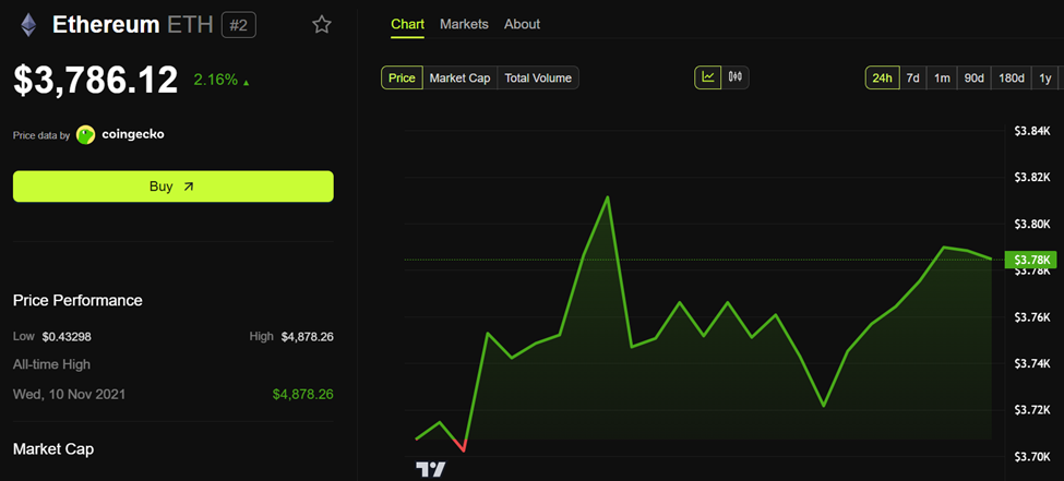 Vid tidpunkten för denna skrivning handlades Ethereum för 3 786 USD, upp med över 2 % under de senaste 24 timmarna.