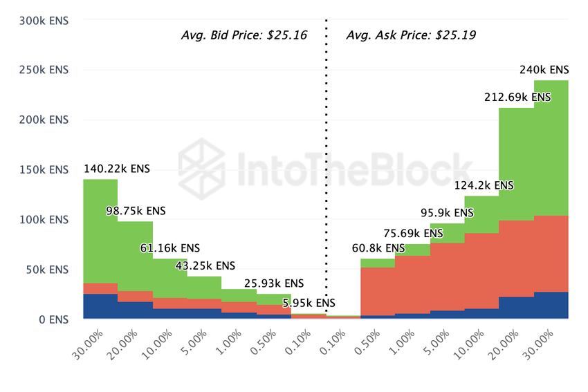 Som det ser ut nu verkar ENS-investerare inte övertygade om att tokens pris kommer att fortsätta att stiga. Som sådan har många av dem lagt beställningar för att sälja. Bevis på detta beslut återspeglas i Exchange-OnChain-marknadsdjupet.