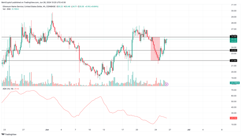 Den 25 juni sjönk priset på Ethereum Name Service (ENS) till 22,95 dollar på grund av marknadens tvekan. Sedan hände något spännande – priset började klättra och steg så småningom till 25,13 dollar tidigt på morgonen den 26 juni.