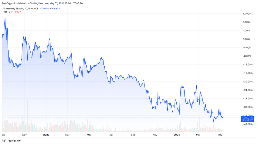 Följaktligen har Ethereums dominans på kryptomarknaden minskat från 17,8% till 15,8% efter uppgraderingen. Dessutom har handelsparet ETH/BTC varit i en nedåtgående trend sedan september 2022.