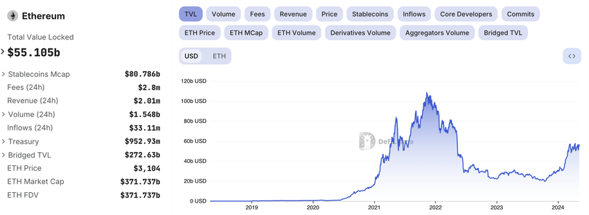 Finansiella indikatorer belyser också Ethereums kamp. Skiftet mot det som vissa kallar “ultraljudspengar” har inte gett genklang hos investerare som förväntat. Dessutom är Ethereums totala värde låst (TVL) i protokoll mycket lägre än dess topp, främst begränsad till staking och restaking aktiviteter.