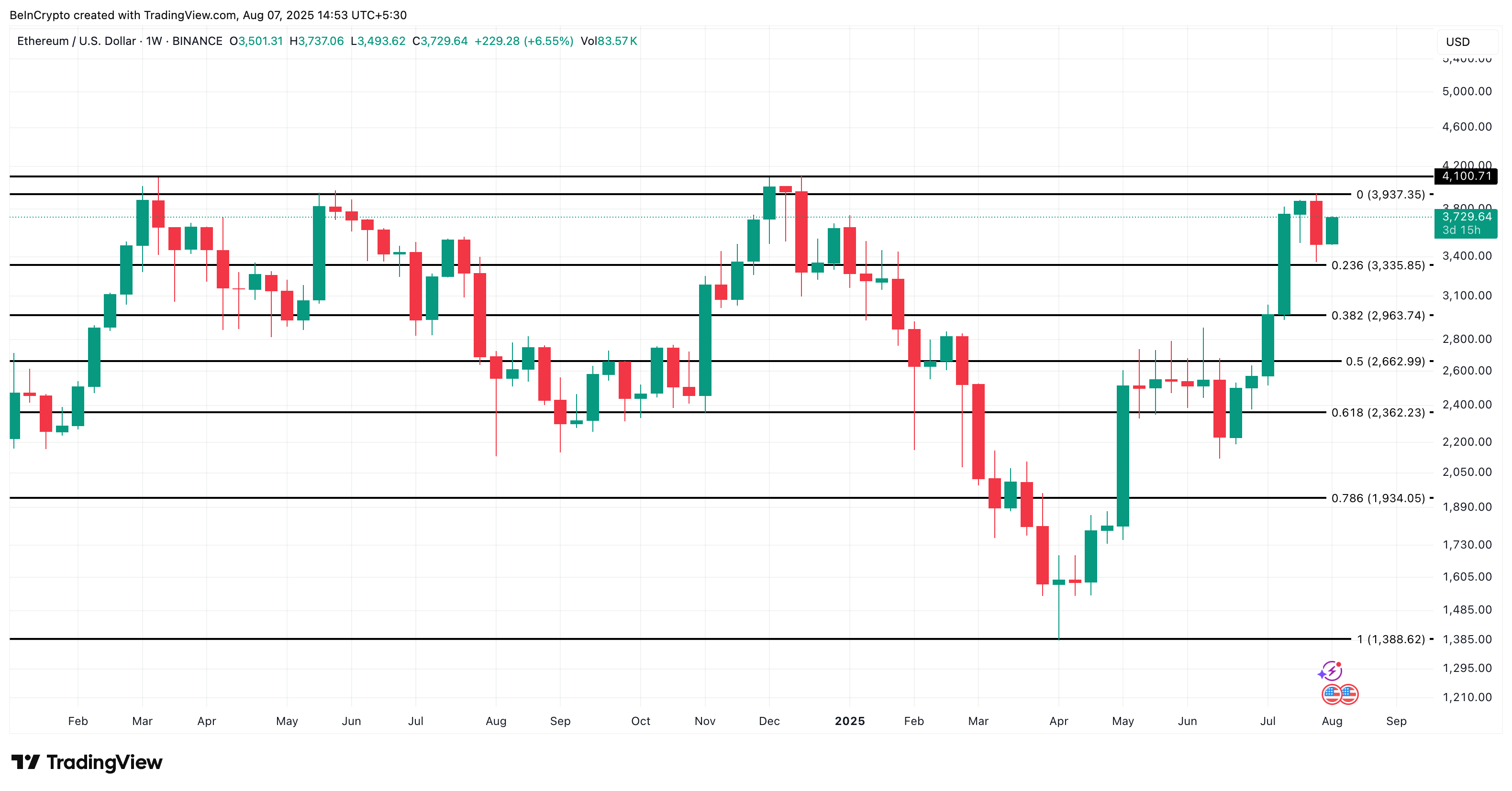 Denna nivå; 3 937 USD, är kritisk enligt det veckovisa prisdiagrammet. I tidigare cykler avvisades Ethereum nära 4 100 USD; mars 2024 och två gånger i december 2024. Men denna gång har ETH-priset inte testat 4 000 USD ännu, trots att det hållit sig över 3 300 USD sedan juni. Detta gör ett återtest av 4 000 USD länge efterlängtat.