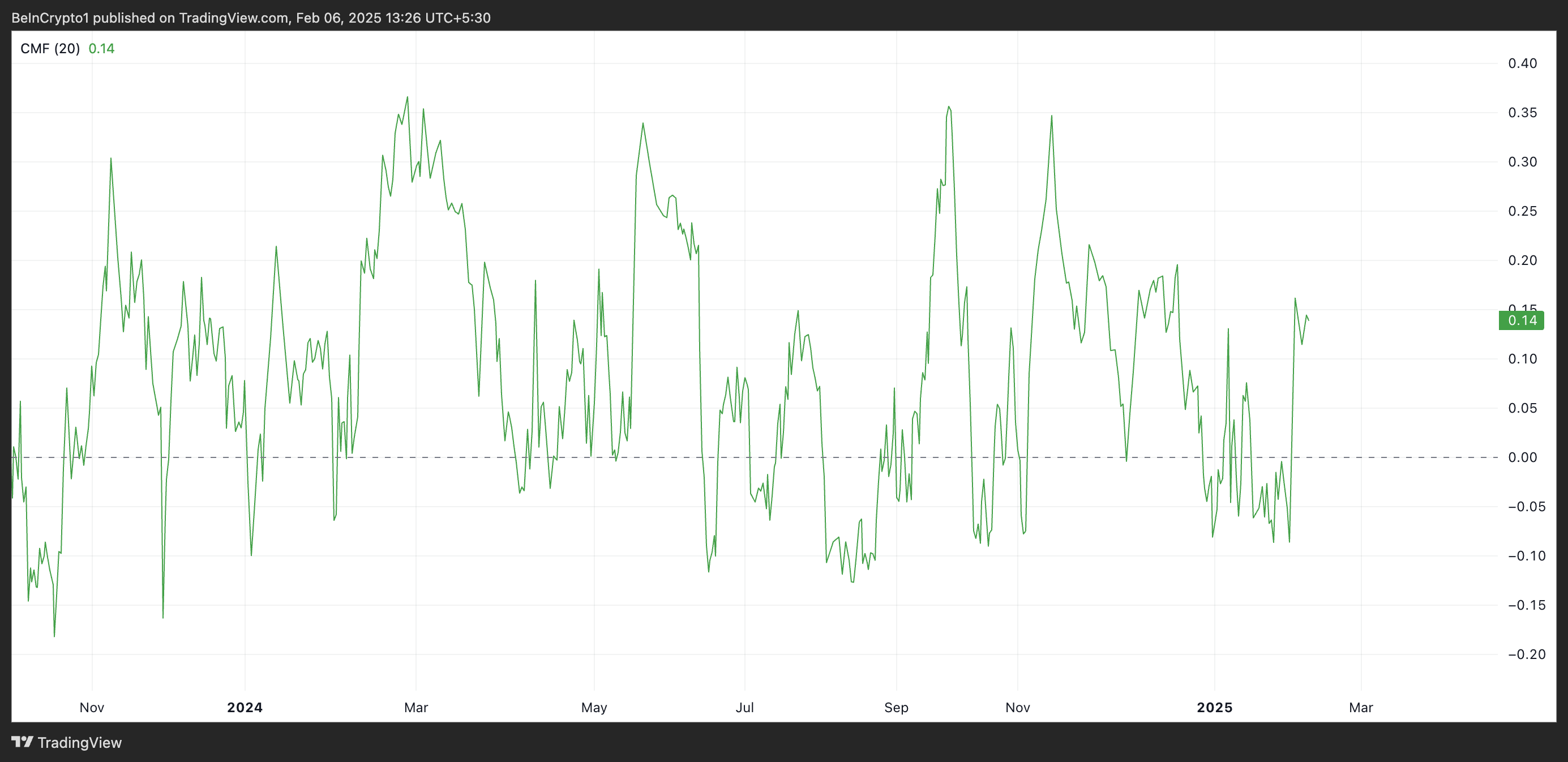BeInCryptos bedömning av ETH/USD en-dags diagram visar att trots ETH:s prisnedgång de senaste dagarna, har dess Chaikin Money Flow (CMF) hållit en uppåtgående trend och bildat en positiv divergens. Vid pressens tidpunkt ligger ETH:s CMF över nollinjen på 0,14.