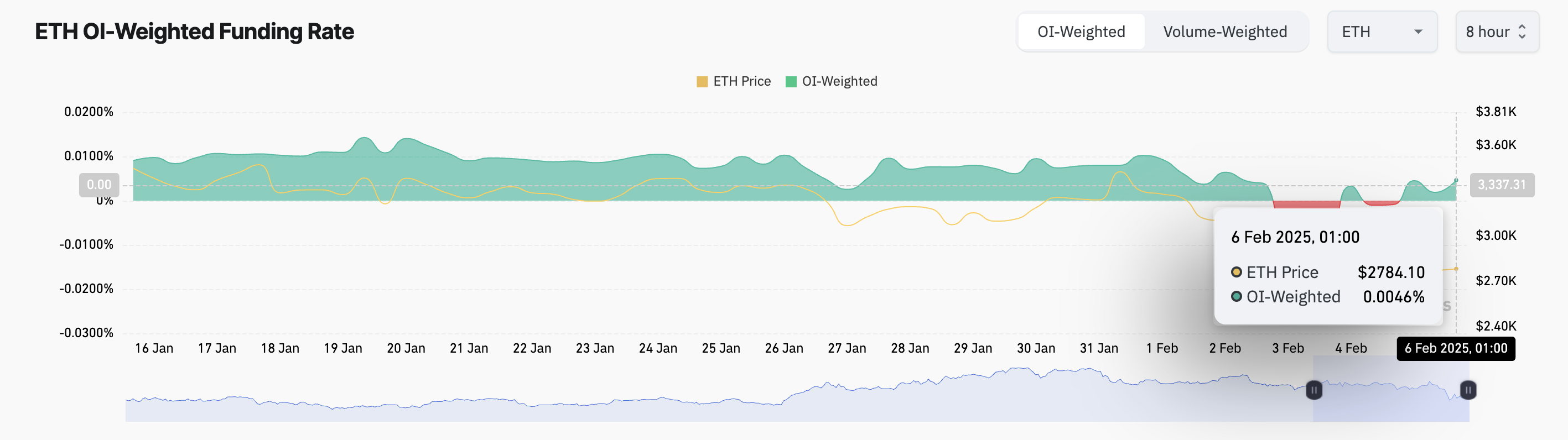 Vidare, efter flera dagar med negativa värden, har ETH:s finansieringsränta blivit positiv igen. Förändringen i marknadssentimentet tyder på att terminsinvesterare alltmer föredrar långa positioner, vilket indikerar förnyat förtroende för ETH:s prisåterhämtning. Vid pressens tidpunkt ligger den på 0,0046 %.