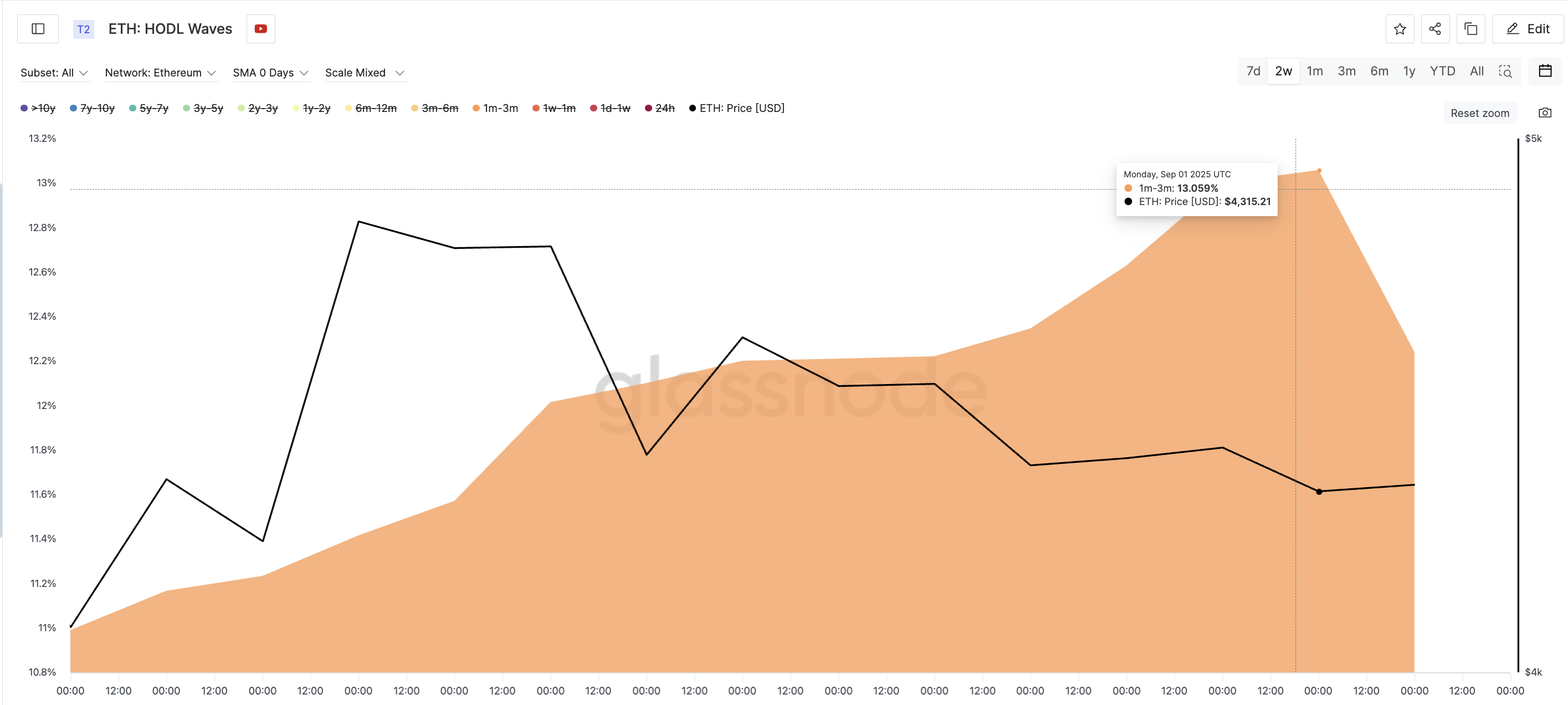Det mer överraskande är att gruppen som är mest benägen att ta vinst — innehavare på en till tre månader — har ökat sitt utbud. Deras andel steg från 10,9 % till 13 % på bara två veckor, trots att ETH gav över 20 % månadsvis och mer än 68 % på tre månader.