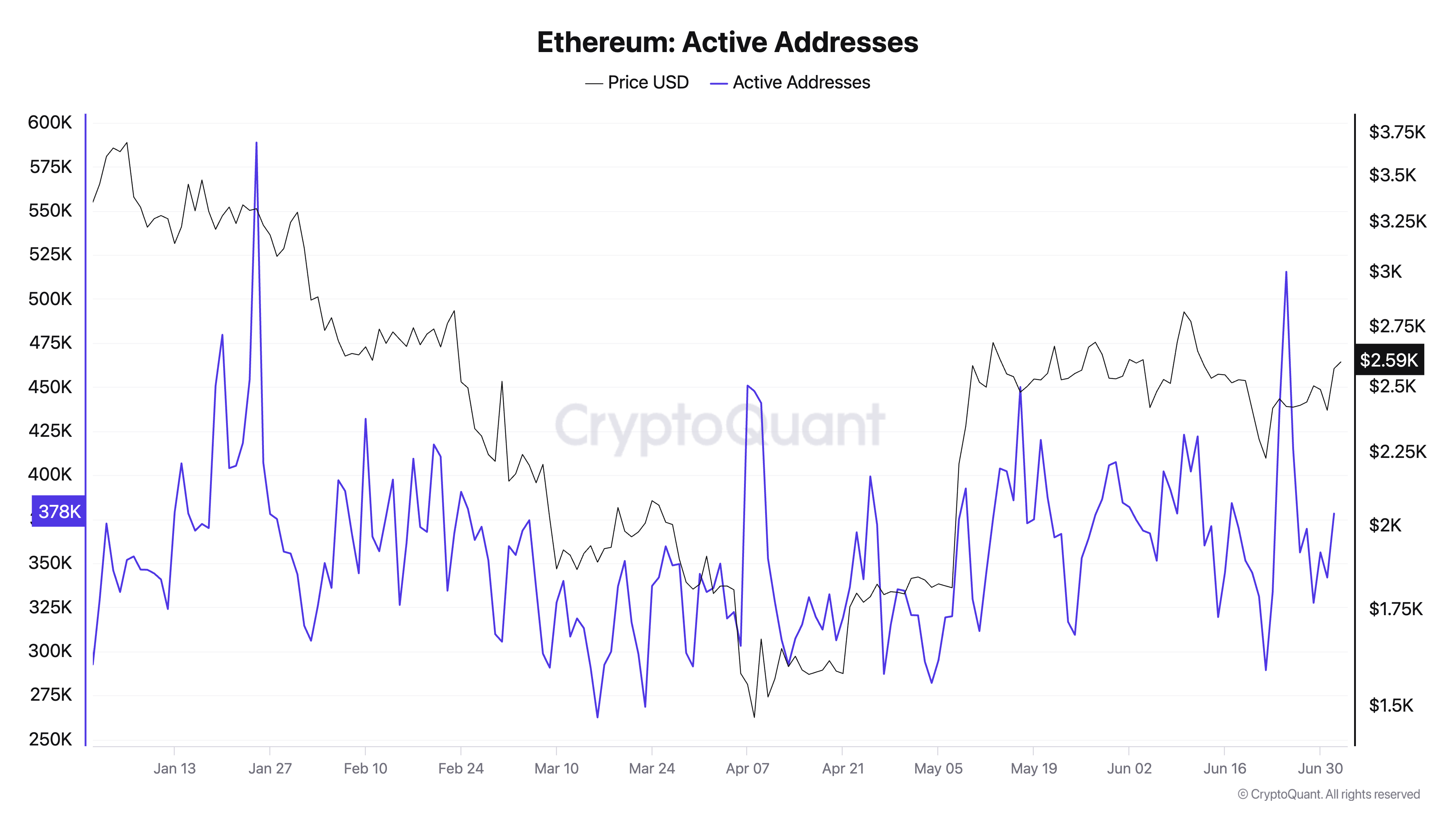CryptoQuant-rapporten noterar att dagliga aktiva adresser som handlar ETH har planat ut mellan 300 000 och 400 000, långt ifrån nivåerna som vanligtvis ses under positiva utbrott.