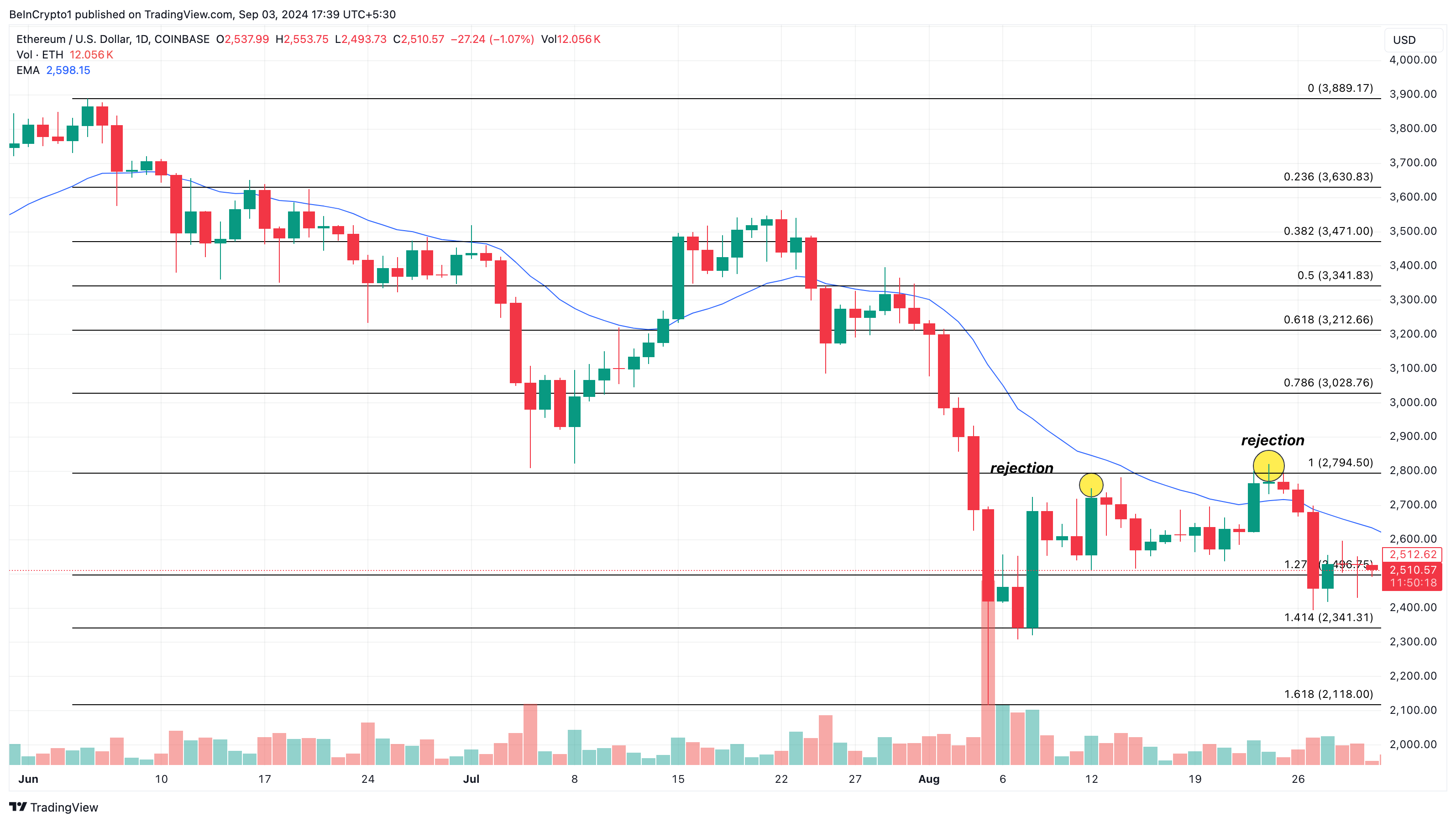 Denna kamp beror till stor del på otillräcklig köpvolym. Om denna trend fortsätter kan ETH:s pris sjunka under 2 500 USD.