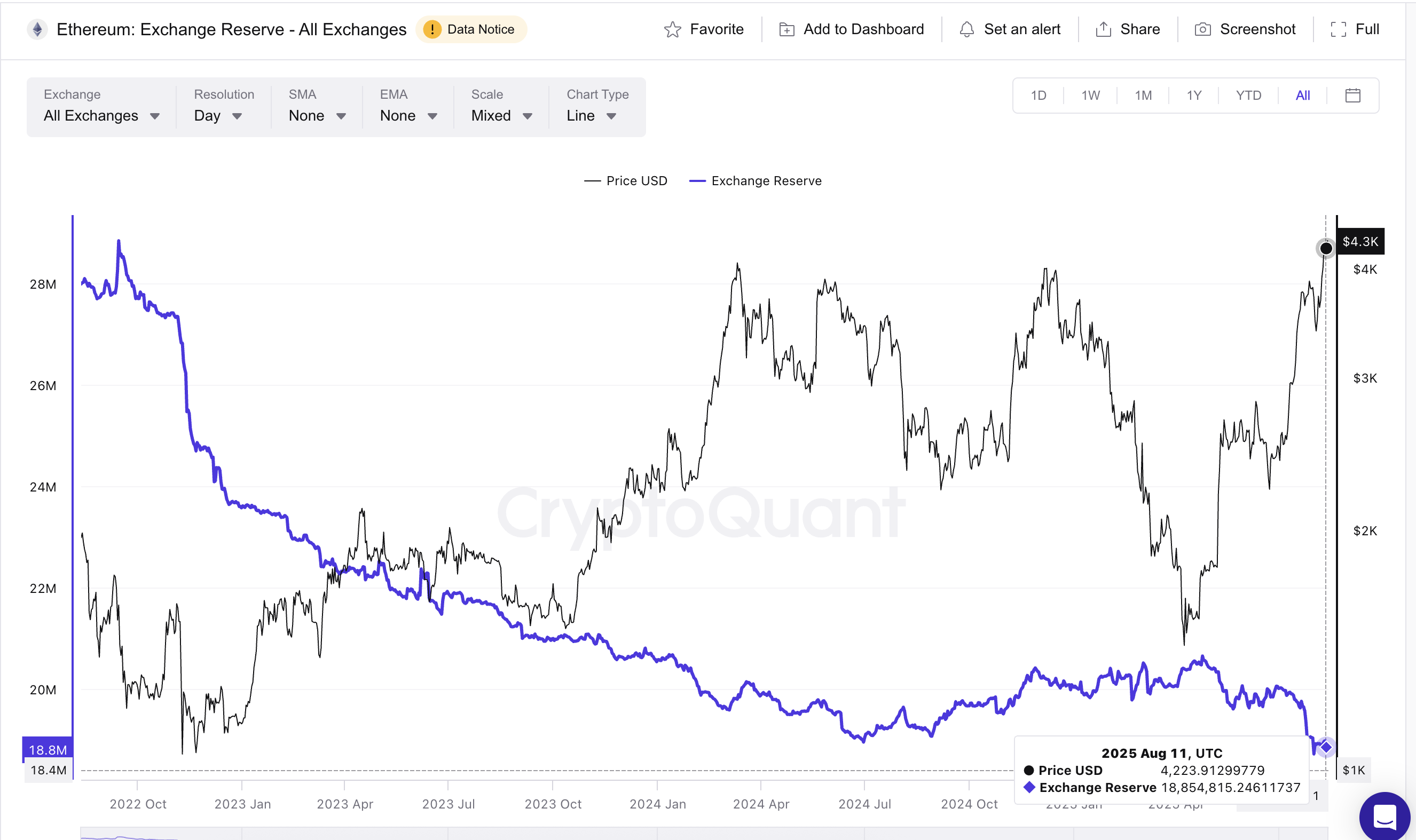 En av de viktigaste indikatorerna att följa under en stark uppgång är börsreserver, den totala mängden ETH som hålls på centraliserade börser. När reserverna är höga finns det mer potentiellt säljtryck. När de är låga är utbudet begränsat, och en ökning i efterfrågan kan snabbt driva upp priserna.