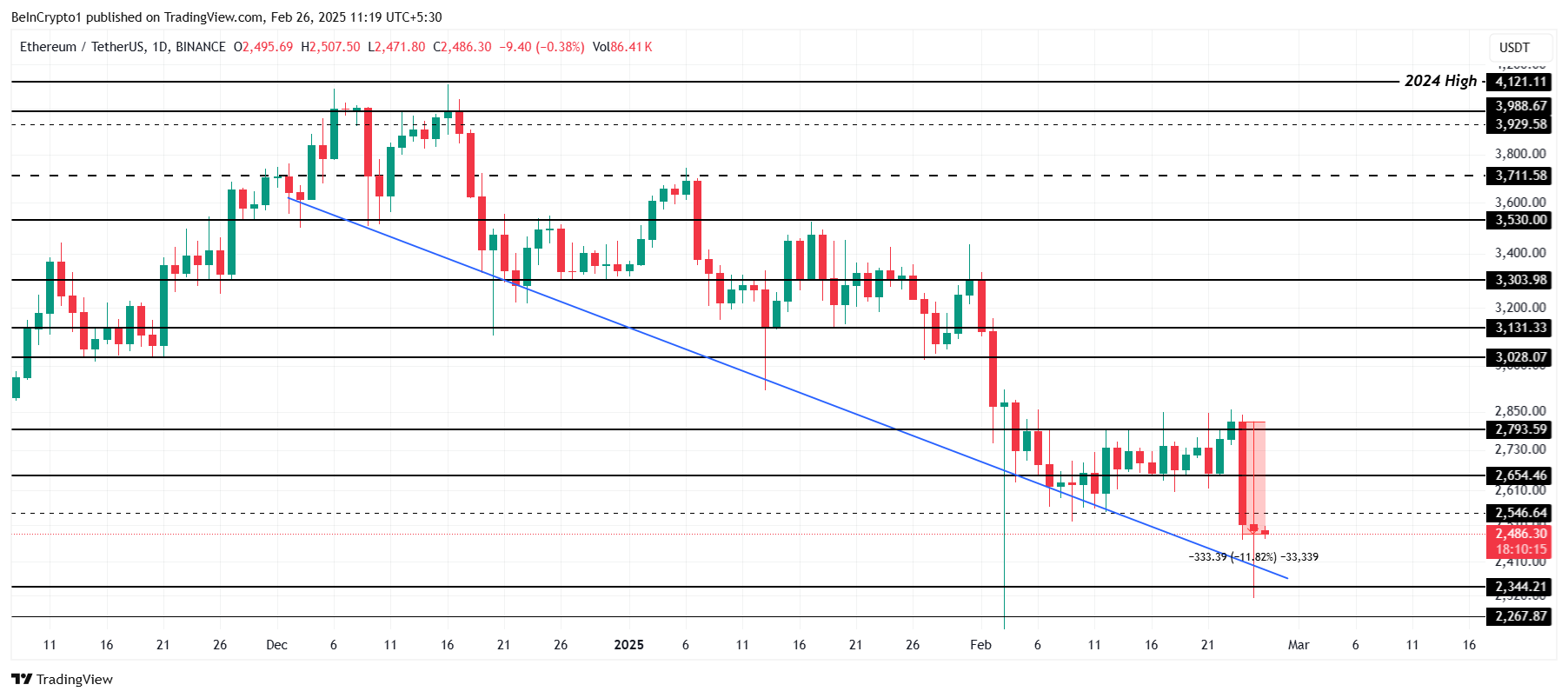 Ethereums pris ligger för närvarande på 2 486 USD, vilket markerar en nedgång på 11 % under de senaste 48 timmarna. Denna nedgång följer ett misslyckat försök att bryta över 2 793 USD motstånd, vilket håller Ethereum i en nästan 3 månader lång nedåtgående trend. Men trots att det är under 2 500 USD visar Ethereums framtida prisrörelser potential för återhämtning.