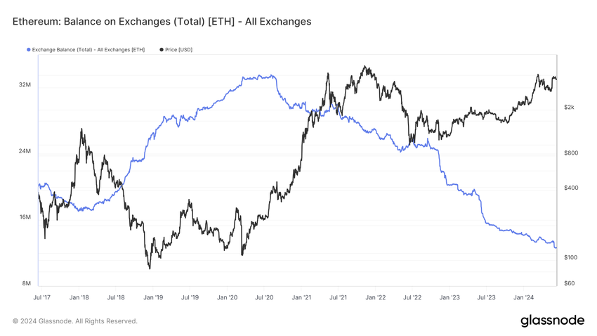 Samtidigt har Ethereums tillgänglighet på kryptobörser minskat avsevärt och nått den lägsta nivån på sju år, vilket rapporterats av on-chain-data från Glassnode. Lark Davis, en erfaren kryptoinvesterare, belyste denna trend.