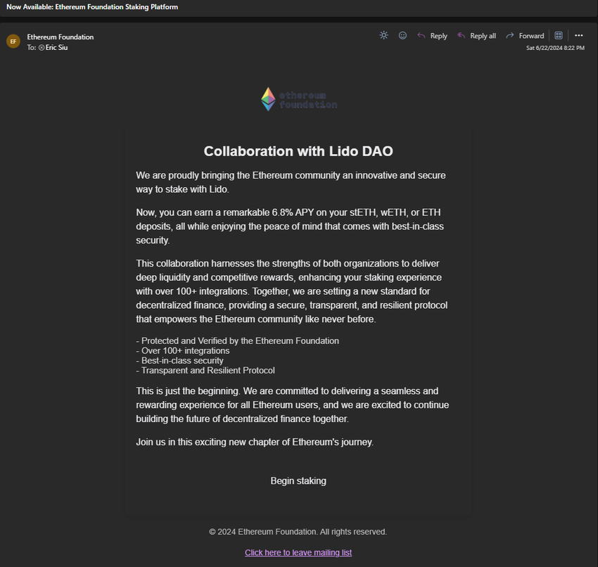 Beiko, som är en av de mest framstående figurerna i Ethereum Foundation, delade ett urval av de e-postmeddelanden som hackarna delade med prenumeranter, med hänvisning till “Ethereum Foundations samarbete med Lido DAO.”