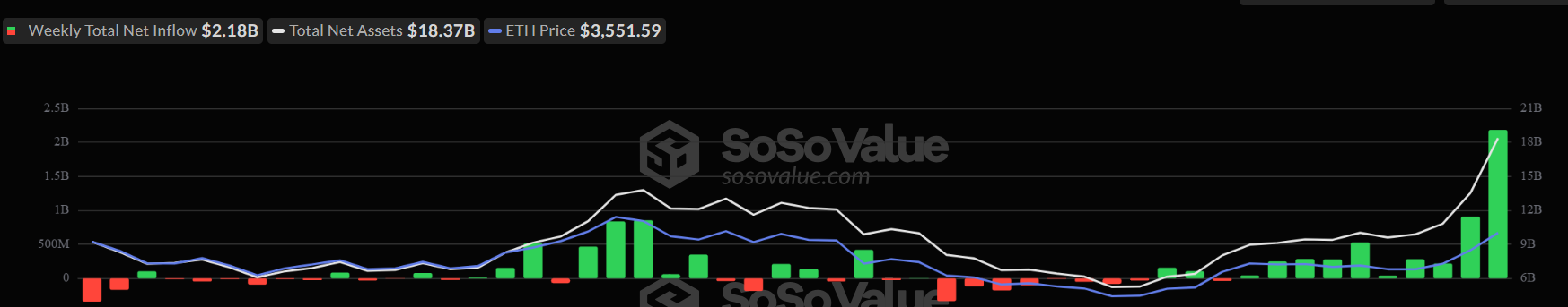 Under de senaste fem handelsdagarna har ETH spot-ETF:er attraherat 2,2 miljarder USD, vilket är mer än dubbelt så mycket som 1 miljard USD veckan innan.