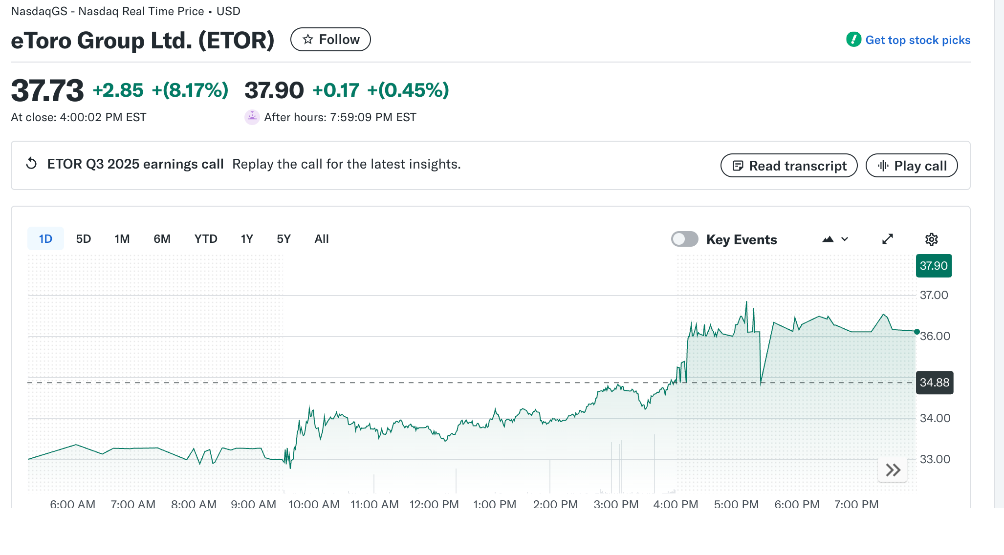 eToro lanserade AI-drivna strategi verktyg, 24/5 handel för stora amerikanska index och en premium prenumeration (eToro Club). Ett återköpsprogram för aktier på 150 miljoner USD—50 miljoner USD genom accelererat återköp—presenterades också. Aktiekursen steg 8 % i tidiga handeln efter publiceringen den 10 november.