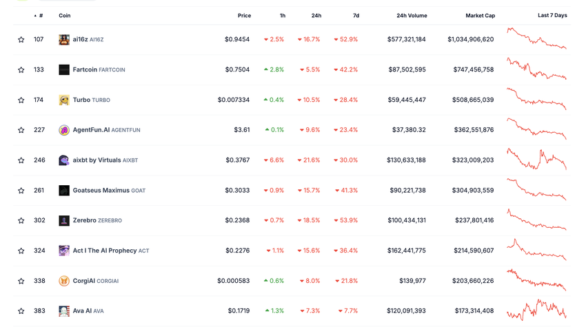Enligt CoinGecko har AI Meme Coins för närvarande över 5,8 miljarder USD i marknadskapitalisering, med över 1,7 miljarder USD i 24-timmars handelsvolymer. För närvarande inkluderar trendande AI meme-mynt ai16z, Fartcoin och Turbo. Bland veckans största vinnare fanns President.exe, WibWob och Truth Terminals Hentai.