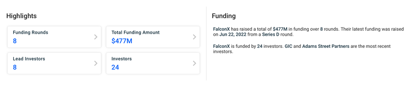 FalconX har samlat in betydande finansiering till 477 miljoner dollar under åtta omgångar, med anmärkningsvärda bidrag från GIC och Adams Street Partners. Den senaste finansieringsrundan, serie D, samlade in 150 miljoner dollar i juni 2022, ledd av B Capital och GIC.