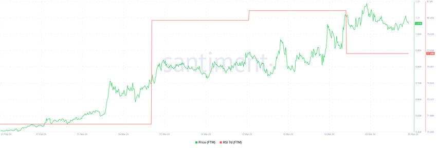 FTM: s 7-dagars RSI, en nyckelindikator för om en tillgång är överköpt eller översåld, ligger för närvarande på 77, vilket visar en liten minskning från förra veckans 81.