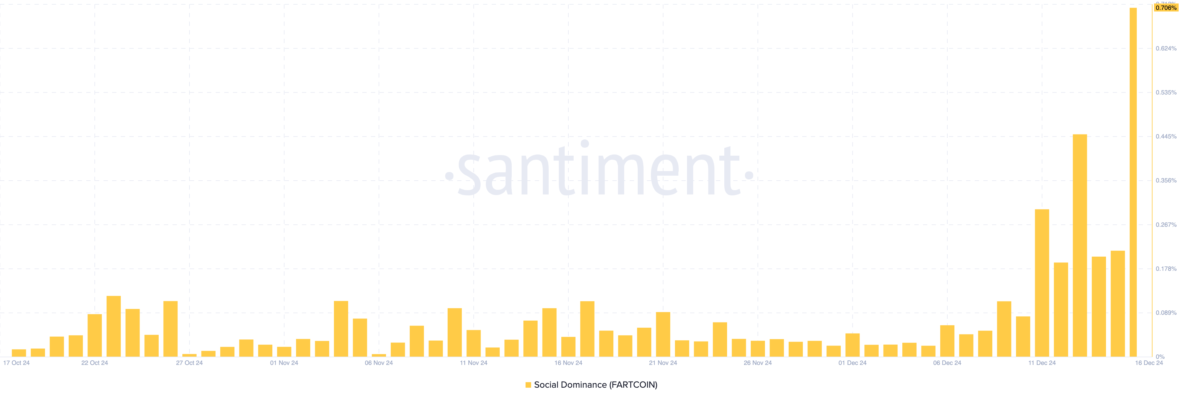 Enligt Santiment har FARTCOINs sociala dominans nyligen stigit till 0,70 %, vilket indikerar ett stort intresse för Solana meme-myntet online. Om denna trend håller i sig kan det öka köppressen och driva meme-myntets marknadsvärde över 1 miljard USD.