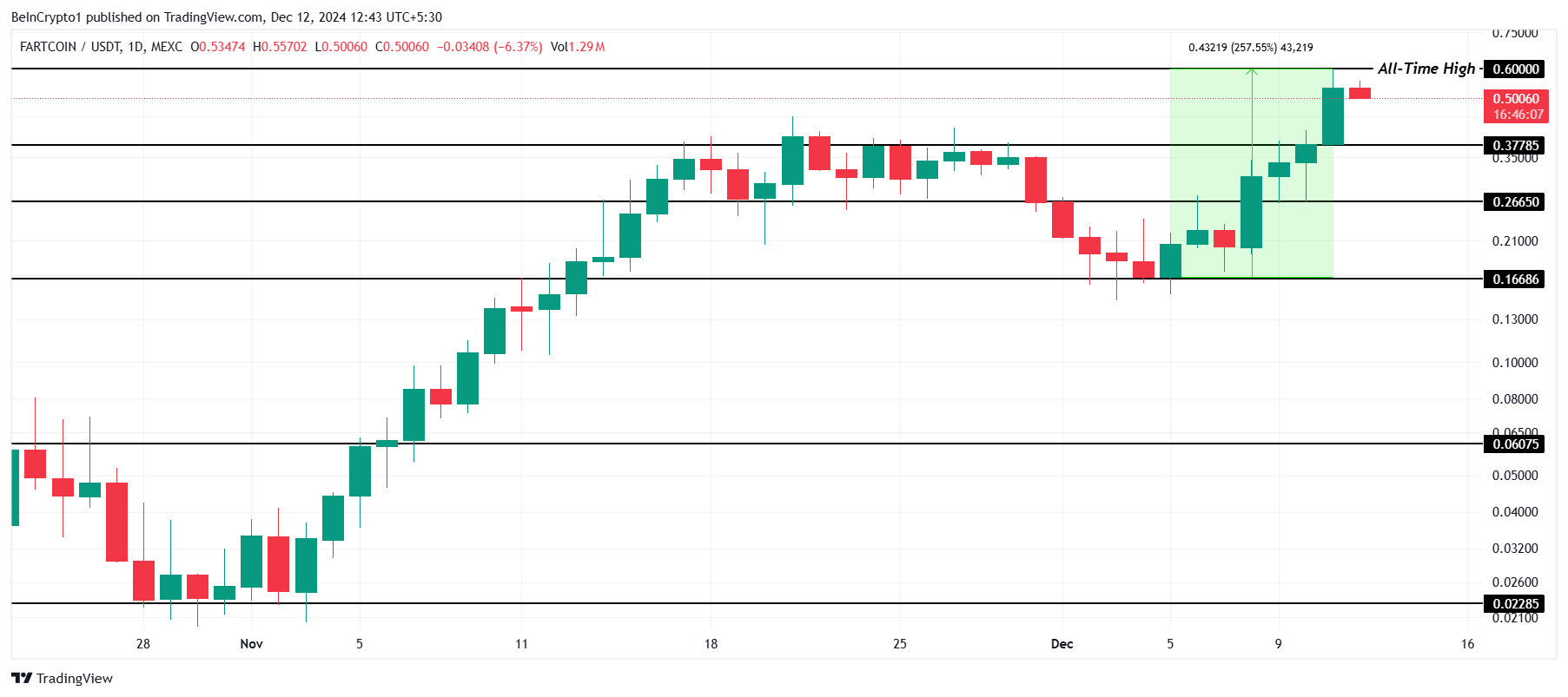 FARTCOIN upplevde en betydande ökning på 58 % under de senaste 24 timmarna, vilket drev priset till en ny rekordnivå (ATH) på 0,60 USD. Detta markerar en fortsättning på tokenens imponerande 257 % ökning under den senaste veckan, vilket fångade investerarnas uppmärksamhet. Rallyt speglar ett växande intresse för meme coins.