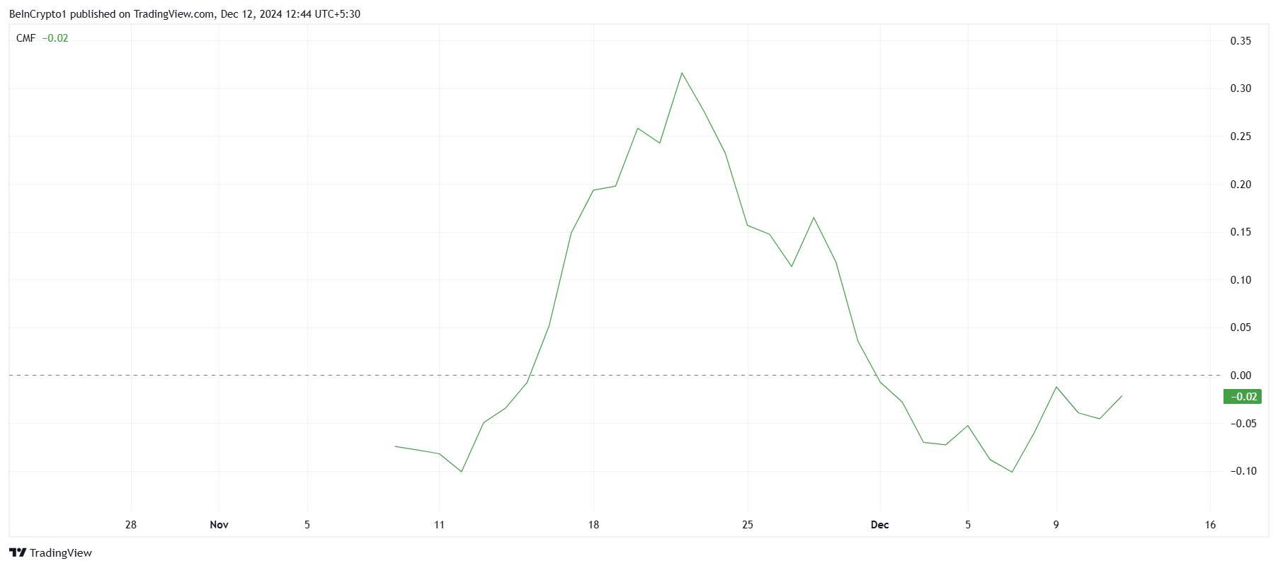 Detta visar att även om fler investerare visar intresse, är känslan ännu inte tillräckligt stark för att etablera en varaktig uppåtgående trend. Den dämpade CMF antyder att många investerare fortfarande är osäkra på att satsa stora mängder kapital på tokenen.