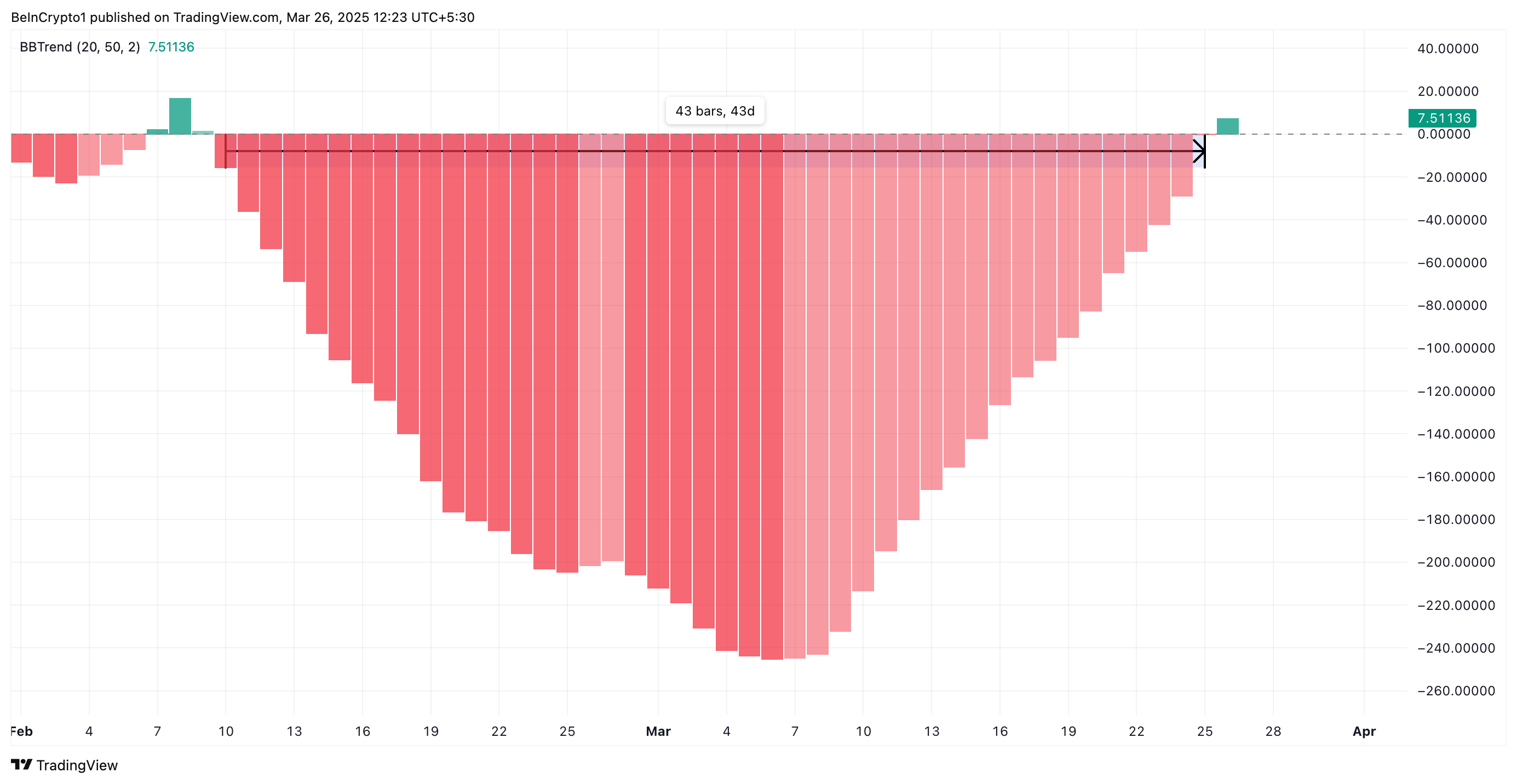 Vidare förstärker den positiva avläsningen från FARTCOINs BBTrend denna positiva utsikt. Vid pressen visar indikatorn en grön histogramstång—den första på 43 dagar—vilket signalerar förnyad uppåtgående momentum.