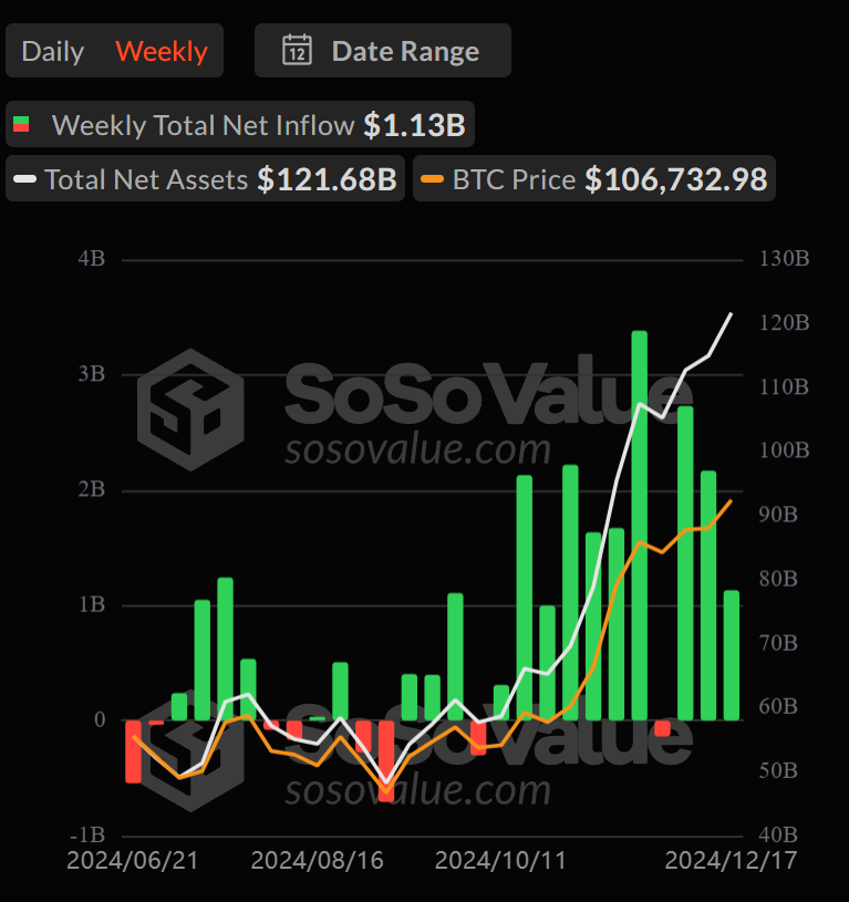 Förra veckans amerikanska Konsumentprisindex (CPI) data för november, som visade en ökning på 2,7 % jämfört med föregående år, lyfte kort marknadssentimentet. Bitcoin steg till ett nytt rekord på 108 000 USD tidigare i veckan tack vare att inflationssiffrorna stämde med prognoserna.