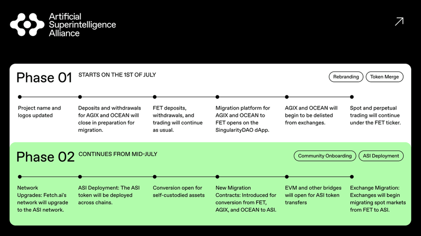 Fas 1 av sammanslagningen av ASI-token fokuserar på att migrera OCEAN- och AGIX-tokens till FET. Denna inledande fas innebär att stänga insättningar och uttag för AGIX och OCEAN för att förbereda sig för migrering. Samtidigt flyttades projektets varumärke till Artificial Superintelligence Alliance på större plattformar.
