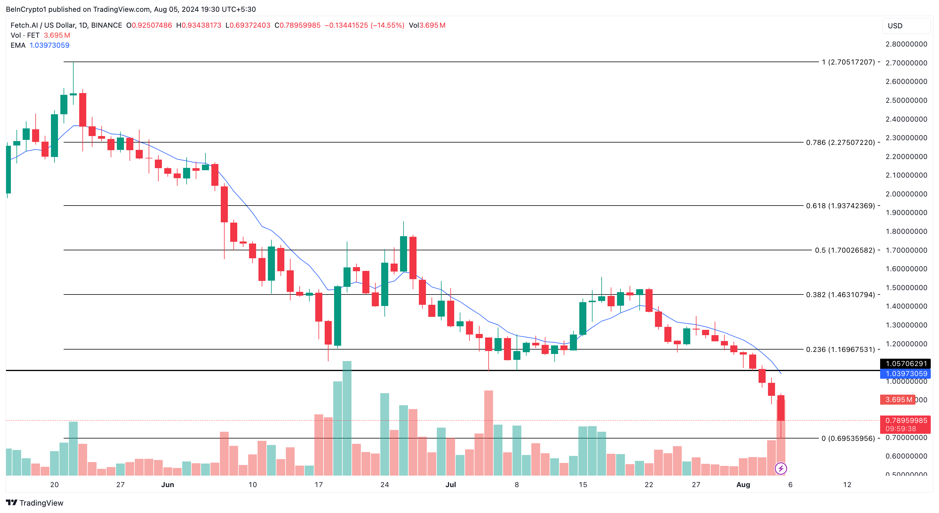 Efter att ha hållit fast vid 1 dollar-marknaden i flera månader har priset på Artificial Superintelligence Alliance (FET) sjunkit under tröskeln. Denna minskning följer på en utmanande kryptomarknad som har sett altcoin-priserna sjunka till nivåer som inte setts på länge.