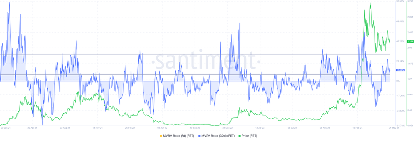 Dessutom stöder förhållandet mellan marknadsvärde och realiserat värde (MVRV) också ett baisseartat resultat. MVRV-förhållandet bedömer investerarnas vinst eller förlust. Fetch.ai: s 30-dagars MVRV ligger på 12%, vilket signalerar vinst, vilket potentiellt kan leda till försäljning.