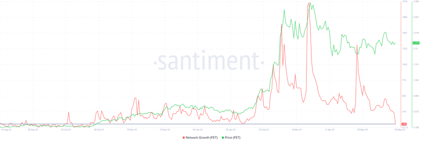 Detta är viktigt för att fastställa om projektet vinner eller förlorar dragkraft på marknaden. I FET:s fall har nätverkstillväxten sjunkit till den lägsta nivån på sju månader, vilket tyder på att investerarna inte ser något större incitament att göra transaktioner på nätverket.