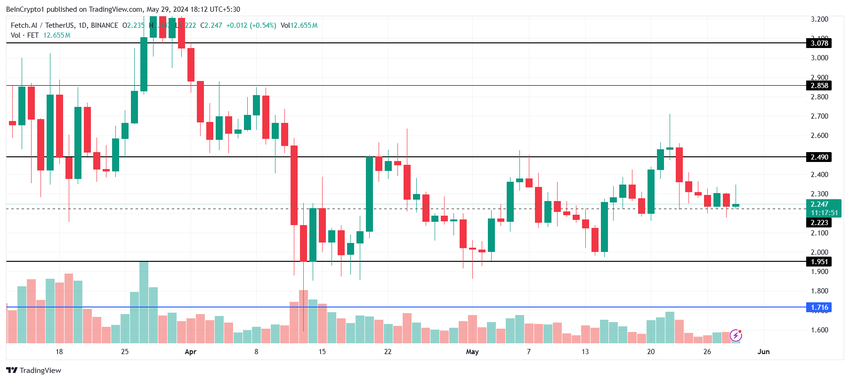 Fetch.ai: s pris, $ 2.24, svävar strax ovanför stöd på $ 2.22. Denna prispunkt har också testats som motstånd tidigare, och att upprätthålla ett drag över det är nyckeln till att säkerställa ett brott på $ 2.49.
