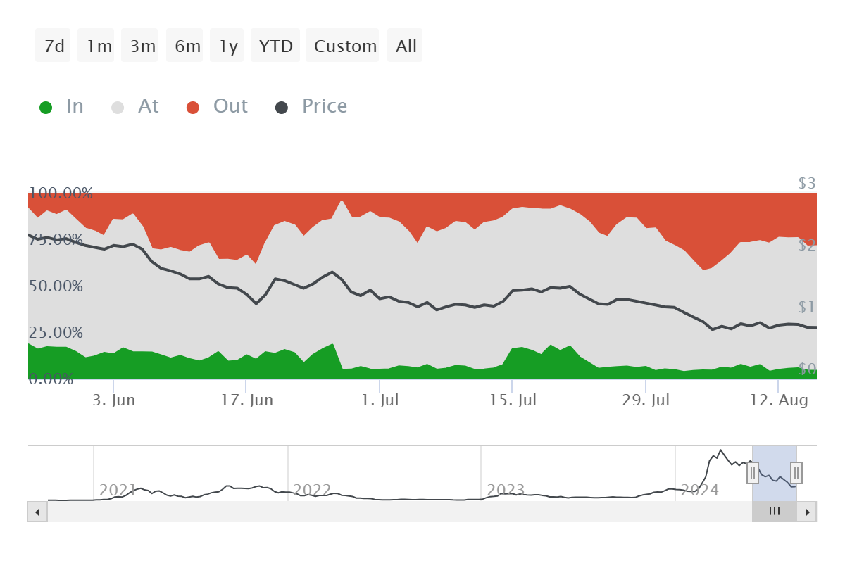 Av de som genomför transaktioner på nätverket, ser mindre än 4% vinst. Dessa investerare tenderar att sälja när de deltar i nätverket, vilket negativt påverkar priset. Därför är en dominans över 25% en negativ signal, vilket inte är fallet med FET just nu.